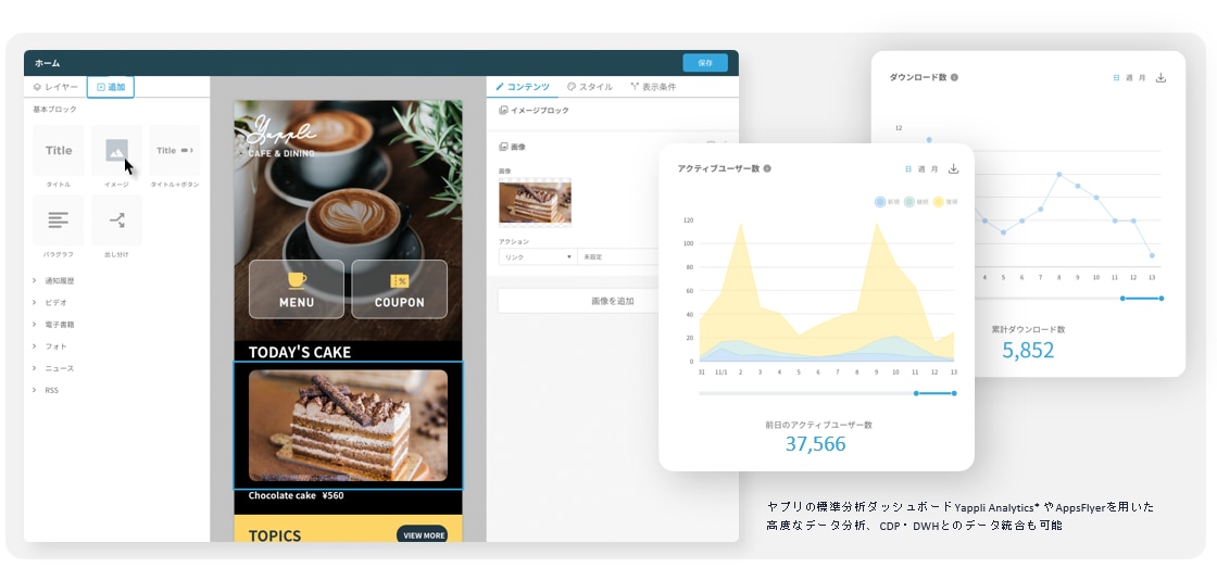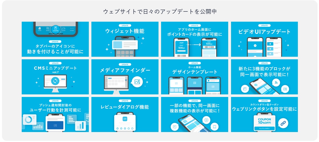 コンテンツ更新や機能・デザイン変更、アプリストア管理、分析まで全てを実現。