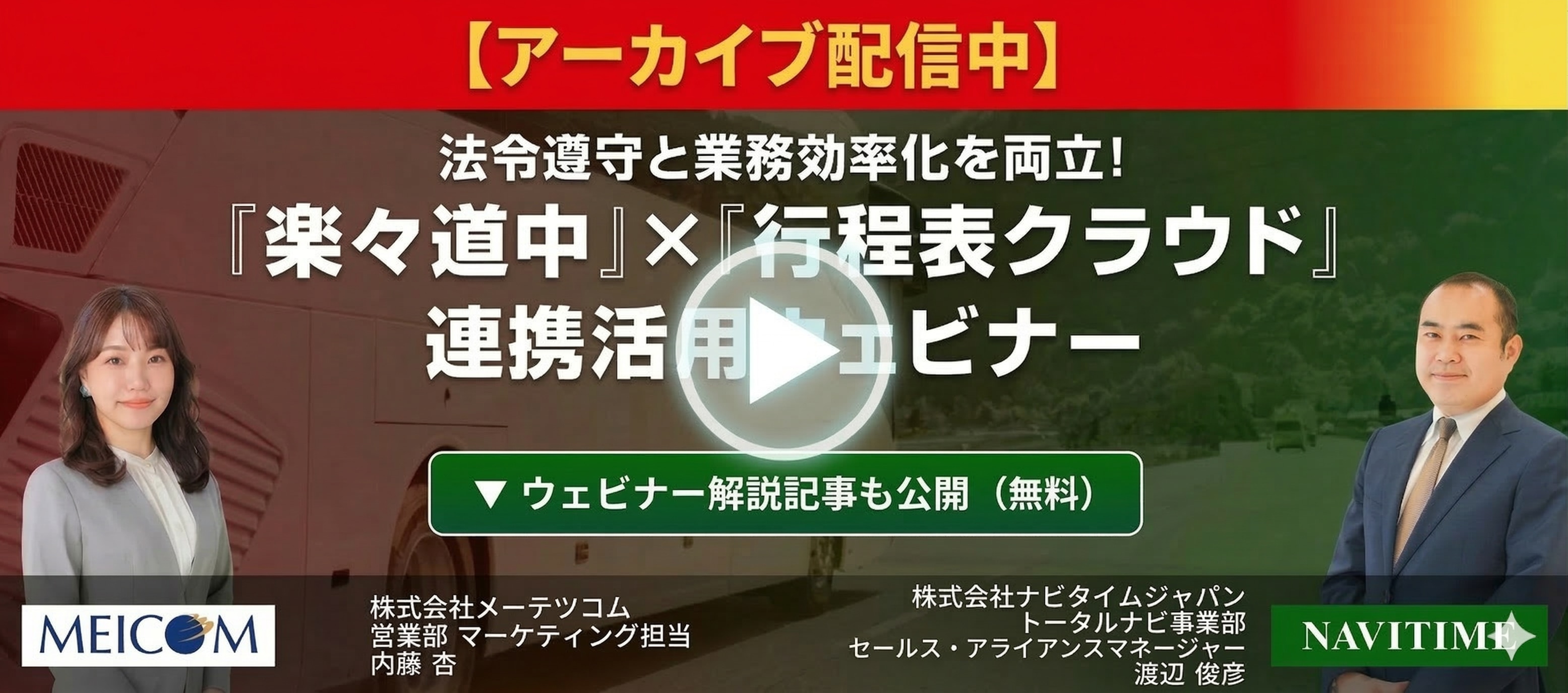 本ウェビナーでは、弊社の『楽々道中』と、株式会社ナビタイムジャパンの『行程表クラウド』の連携による最新の活用ポイントをご紹介します。