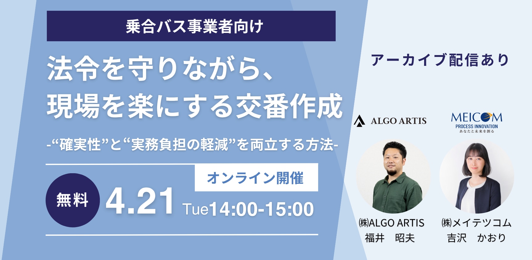 ALGO ARTISが提案する「AIを活用した仕組み化」とメイテツコムが提供する「バス業界に特化した勤怠管理」を組み合わせた最新の解決策を公開します。