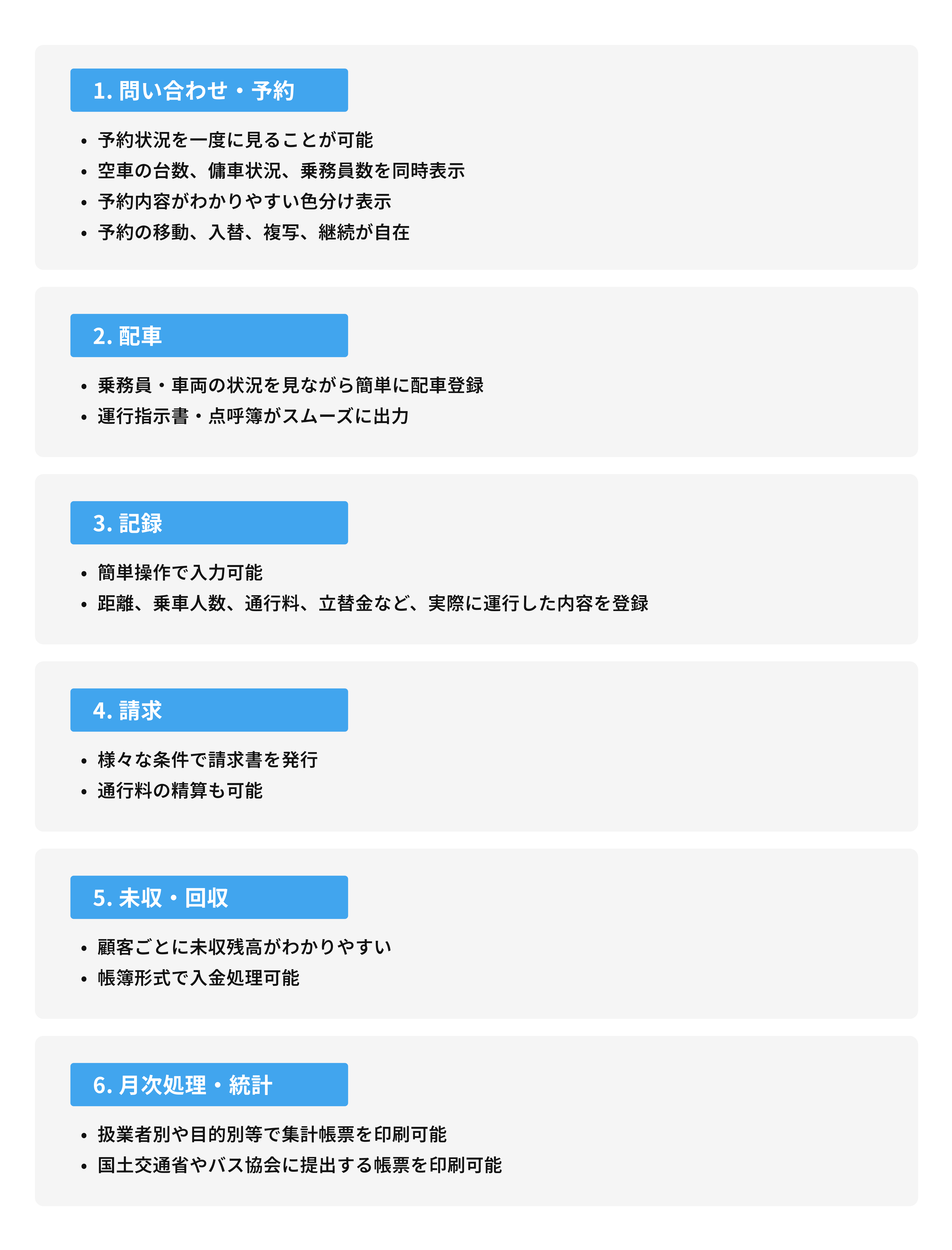貸切バス業における、予約業務・配車業務・未収業務を一連の流れの中で行うことができます。また、貸切バスに対応した法令順守項目の節句も同時に実施。
