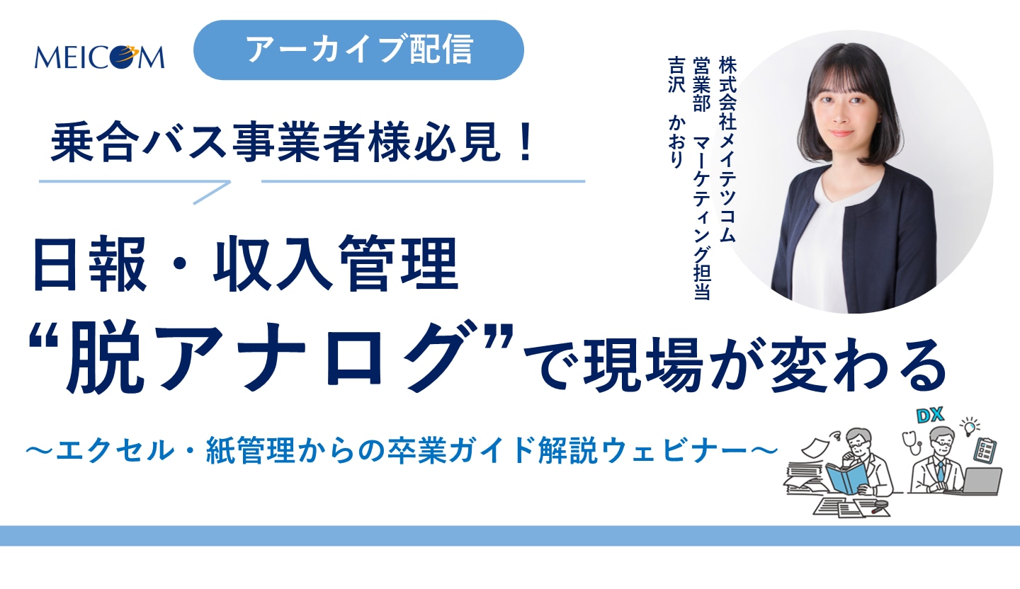 タイトル | 乗合バス事業者様必見!日報・収入管理 "脱アナログ" で業務が変わる ~ エクセル・紙管理からの卒業ガイド解説ウェビナー ~ |